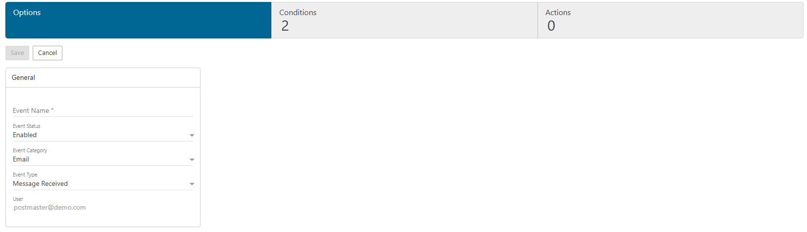 - Once your conditions and actions are set, click Save. The event will begin monitoring immediately.